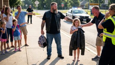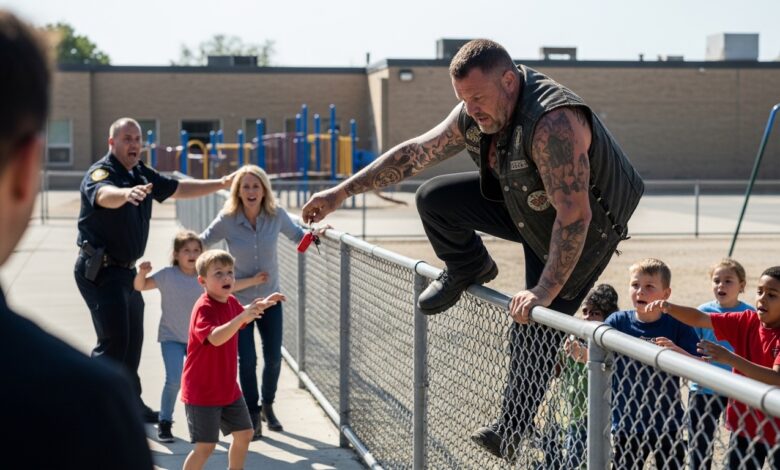 The moment a leather-clad biker vaulted over an elementary school fence in broad daylight, every…