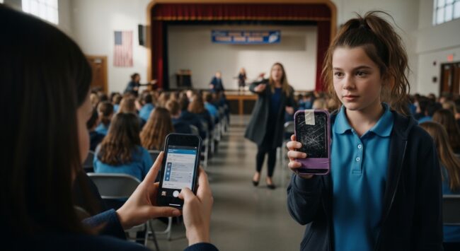 Lily stood near the principal, shoulders slightly rounded, hands wrapped around that old phone as if it were something fragile and alive.