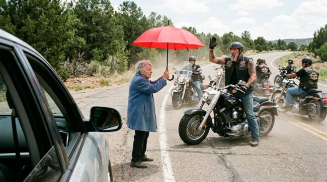 The first thing I saw was a tiny old woman in a faded blue coat, standing in the middle of a two-lane road with one trembling red umbrella raised like a warning flag while thirty motorcycles bore down on her—and for one impossible second, it looked like she wanted to die there.