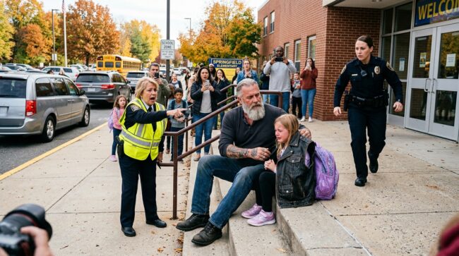 A mother in a tan coat had her phone halfway raised, recording from behind a row of trimmed hedges as if documentation itself could protect the child. A man in scrubs, maybe coming off shift at the county hospital, muttered that security should have been outside already. Two fourth-graders waiting near the bike rack were dragged farther back by an older sister who kept glancing over her shoulder. Every face in the pickup lane wore the same strained uncertainty: if this man meant well, why did he look so wrong for the moment?