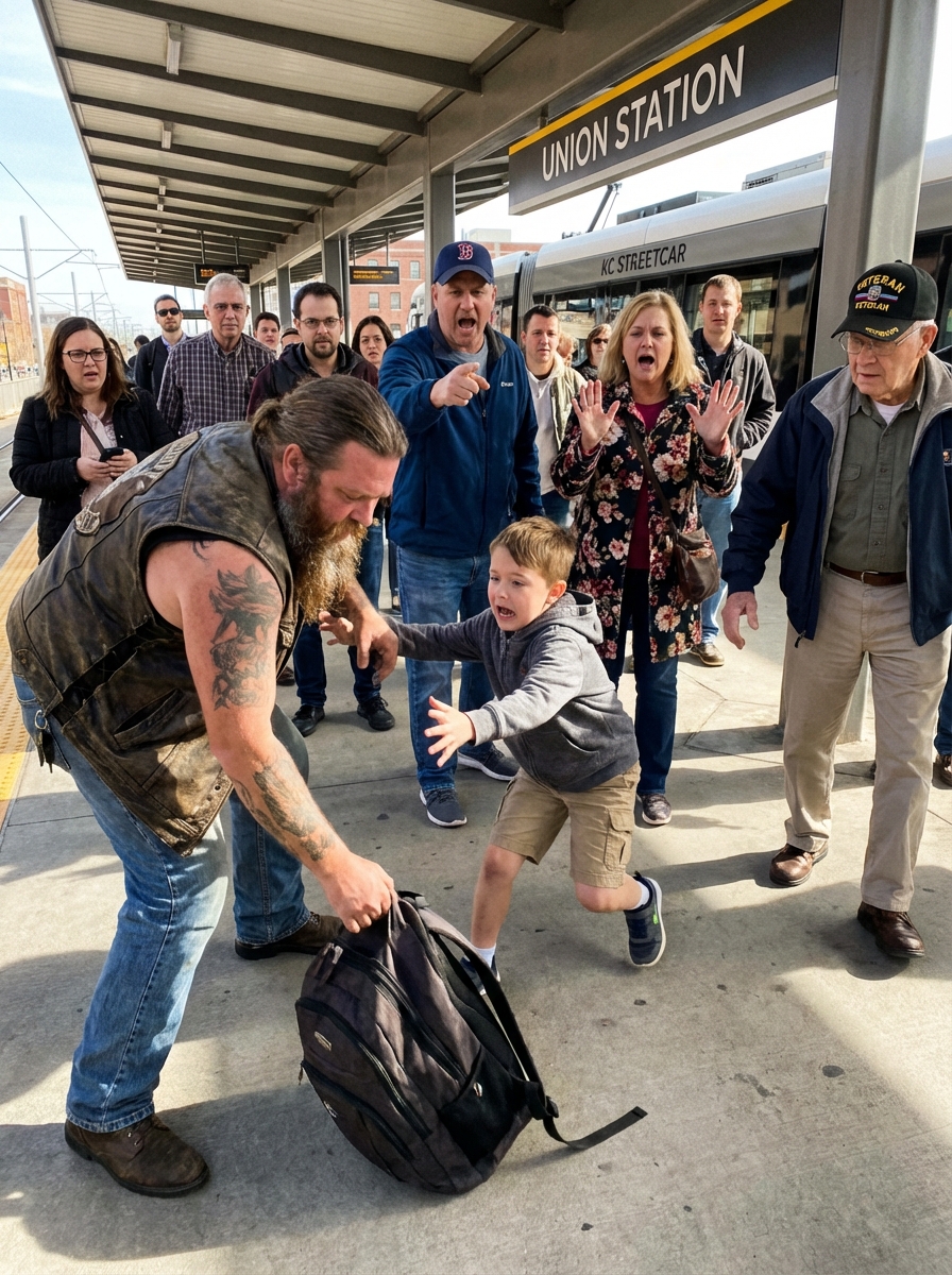 The boy shouted first. “My bag!” His voice cracked with panic as he tried to run toward it, but the biker caught him by the upper arm and pulled him back, placing himself between the child and the backpack like it might bite. That was the moment the whole platform turned on him.