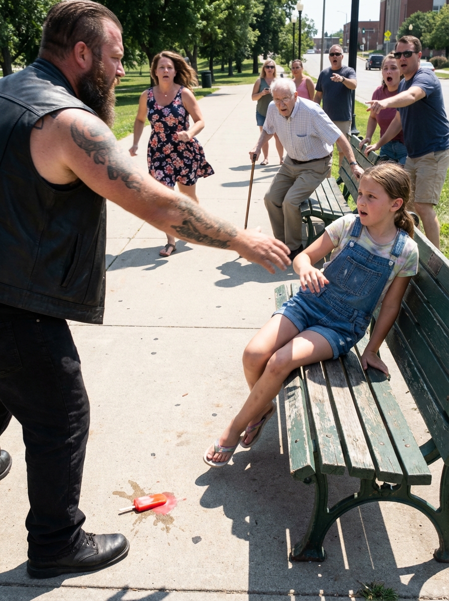 The whole park froze when a tattooed biker grabbed a little girl by the arm and yanked her off a bench so hard she hit the ground—“Move!” he barked, but what had terrified him first?