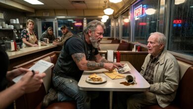 The older woman hesitated, eyes flicking over the group behind him—six other riders, just as rough-looking, just as out of place. Leather. Boots. Silence.
