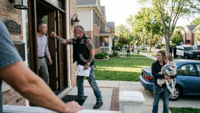 Six… maybe seven motorcycles rolling slowly into the street, their engines cutting through the quiet neighborhood like something out of place—too loud, too heavy, too deliberate.