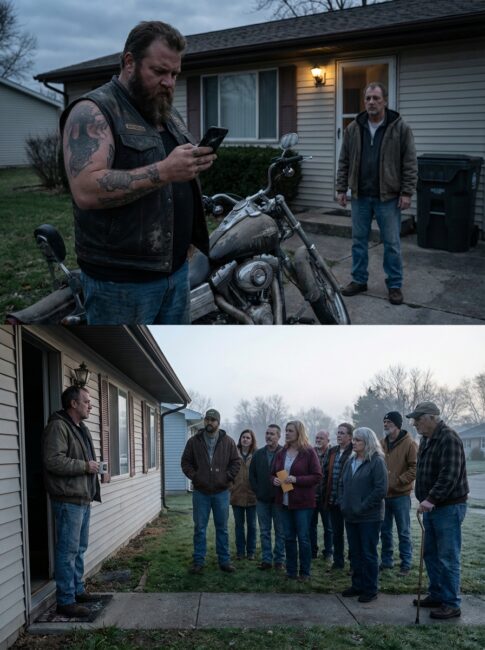The most ordinary thing I did that evening was hand a stranger my old cracked phone so he could make a quick call, but the strange part was the way the biker stood there staring at my house afterward—and the next morning, when I opened my front door, there were seven people standing silently on my lawn like they had been waiting for me.