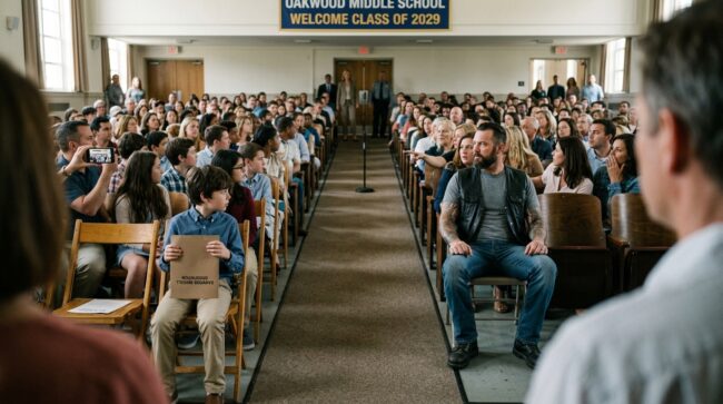 The principal, Dr. Karen Whitmore, was standing near the stage going over her opening remarks with the vice principal when she noticed the ripple passing through the room. She followed everyone’s line of sight and saw exactly what they saw: a biker sitting among parents at a middle school orientation, watching a boy who clearly did not know what to do with him.