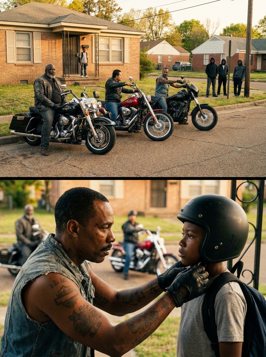 The escort ended because Malik didn’t need it anymore. Not because the gang was gone — the gang is still there, will always be there — but because Malik was a different kid. He had posture. He had a phone number of a biker who said 24/7. We come. He had three men he could call if anything slipped sideways.