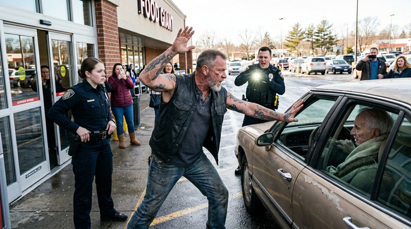 He came in the way people in real life often entered the edge of trouble—too fast, too direct, and already making everyone who saw him regret that he was there. One moment the officers had the old Buick, the confused man inside it, and a ring of cold spectators around the parking lot. The next there was a broad-shouldered biker in a leather vest walking out of the dark and into a live police stop with both hands visible but absolutely no permission.