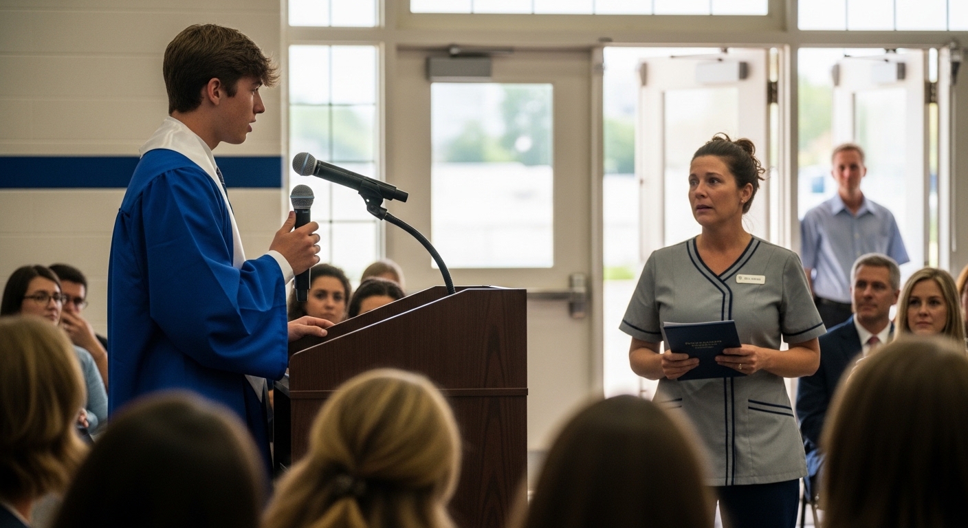 That night at graduation, while parents fanned themselves inside the warm auditorium, Maria stood in the hallway under fluorescent lights that flickered faintly.