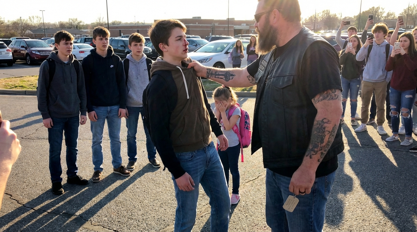 The Biker Grabbed a Bleeding Boy by the Collar — And Everyone Thought He Was About to Make It Worse