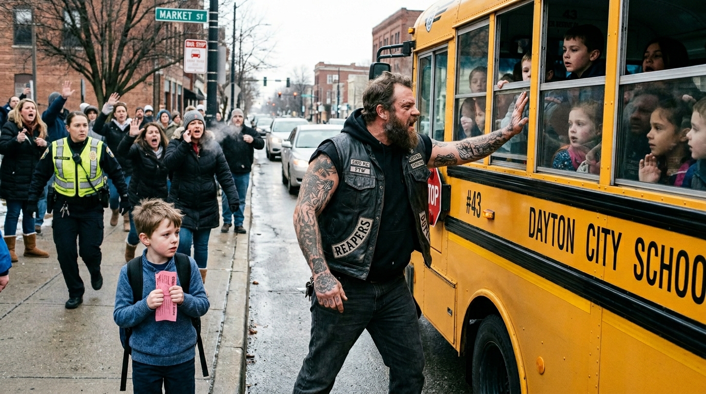 At 7:18 on a cold Thursday morning in Dayton, Ohio, the biker pointed at the school bus and growled, “Open that door,” and every parent at the curb took one step back.