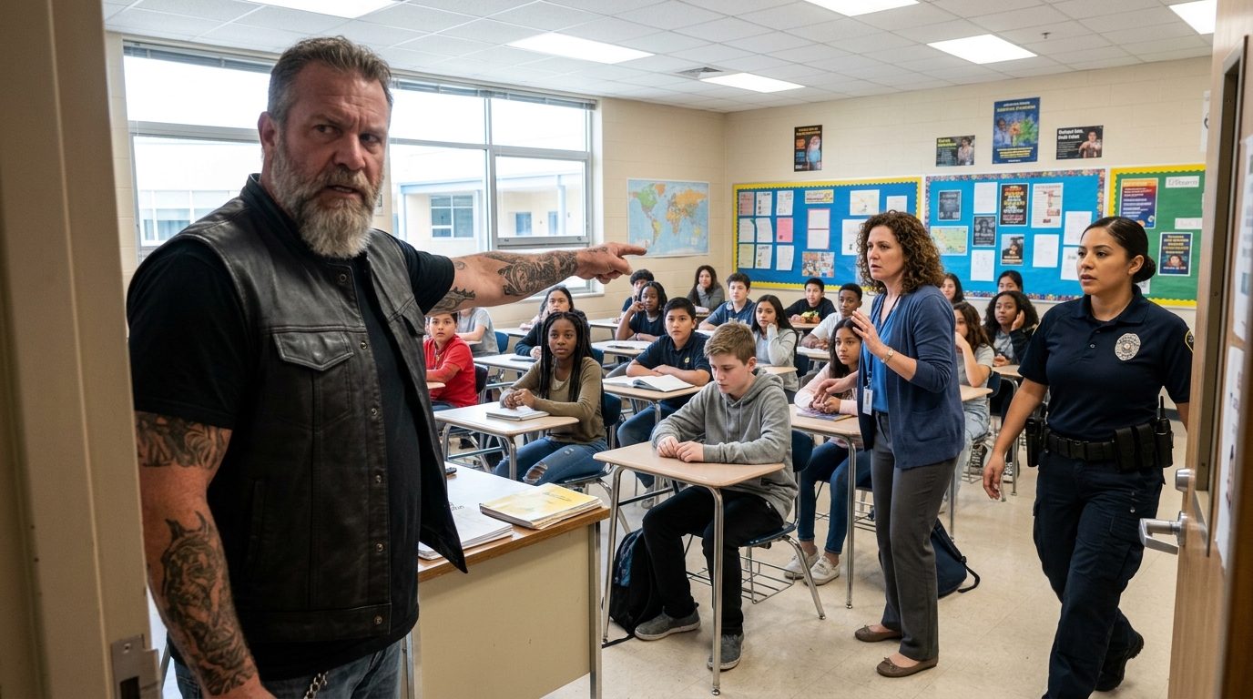 Every head in the classroom turned so fast the room seemed to tilt with it. A second earlier, the only sound had been the hum of old fluorescent lights and the dry scratching of pencils being boxed into backpacks. Then this man—broad-shouldered, leather-vested, tattooed from wrist to elbow, with a beard that made him look older than he probably was—appeared in the doorway like trouble that had finally found the right address.