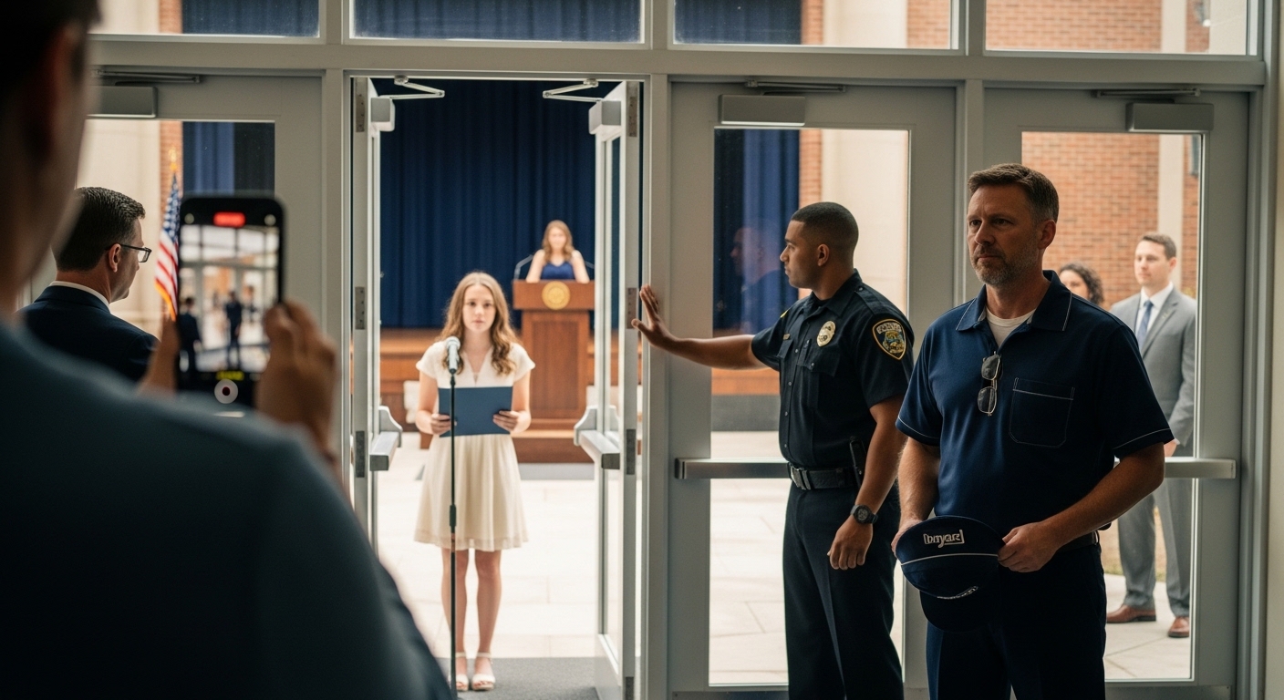 What none of us understood yet was why the principal would soon leave the stage mid-ceremony… and walk directly toward those glass doors.