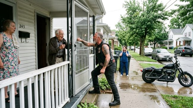“There’s a man harassing an elderly resident,” she said, her voice flat with adrenaline. “Leather vest, tattoos, motorcycle. He’s trying to get inside.”