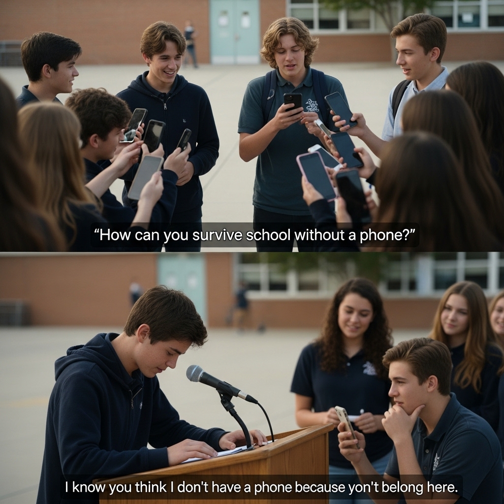 A boy without a smartphone in a school where everything—friendships, homework, status—lived behind glass screens.