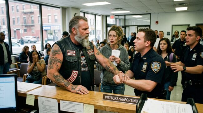 The biker didn’t look like someone who walked into police stations unless something had already gone bad. He was tall, broad-shouldered, mid-50s maybe, with a gray-streaked beard and tattooed arms partially visible beneath a sleeveless leather vest. His expression wasn’t angry.