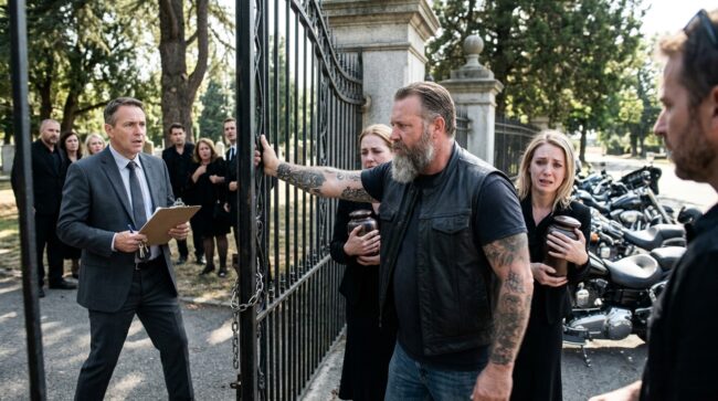 “Open that gate,” a biker said flatly as engines roared behind him, surrounding the cemetery entrance while a grieving woman clutched an urn no one would let her carry inside.