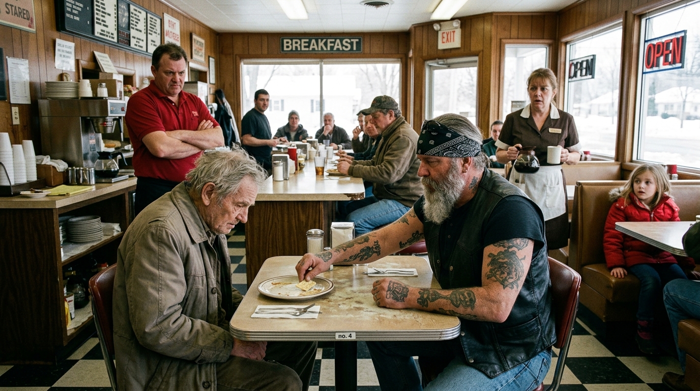 The biker reached the back booth, slid in across from the old man, and pulled the untouched cracker packet toward himself as if he had been invited. Then he looked over his shoulder at Marty and said the line that emptied the room of all comfortable noise.