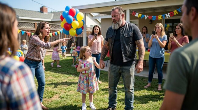 “Come on, sweetheart—let’s get you out of here,” the biker said, taking the little girl’s hand in front of everyone while her friend’s mother shouted for him to stop.