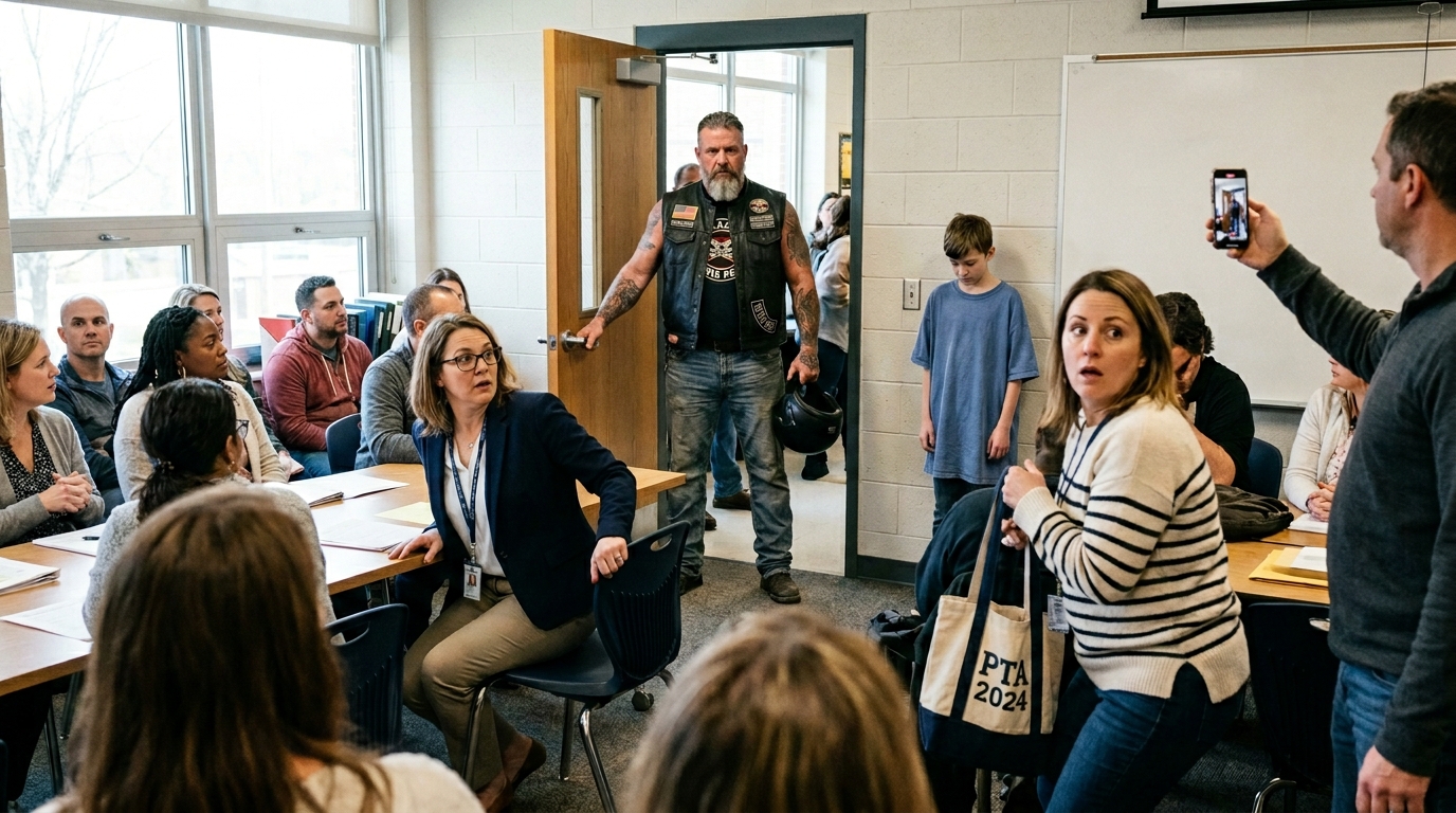 “Say that about his clothes again,” the biker said from the doorway of the parent meeting, his tattooed arm still on the handle as a room full of adults turned and a twelve-year-old boy froze beside the wall.
