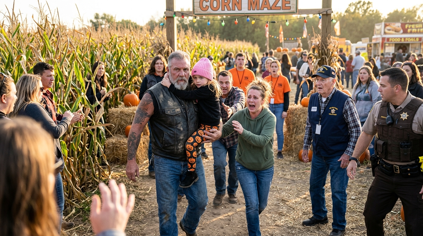 “Don’t let him leave with her!” someone screamed as the biker came out of the corn maze carrying the missing girl against his chest—but why was she clinging to him instead of crying?