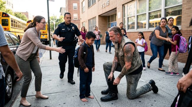 “Hey kid… why aren’t you wearing shoes?” the biker asked as he pulled up behind a crying boy outside the school gate, engine still rumbling low.
