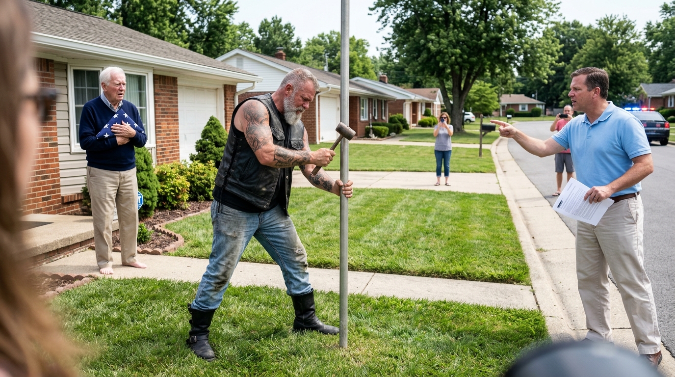Everyone on Briarwood Lane started filming when a biker drove a steel post into an old veteran’s lawn and said, “Move him again.”